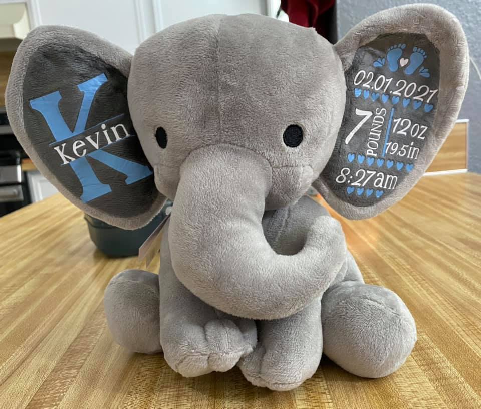 Diese Elefanten sind mit den Geburtsdaten des Babys auf dem Ohr das perfekte Geschenk für das Kinderzimmer eines Neugeborenen!