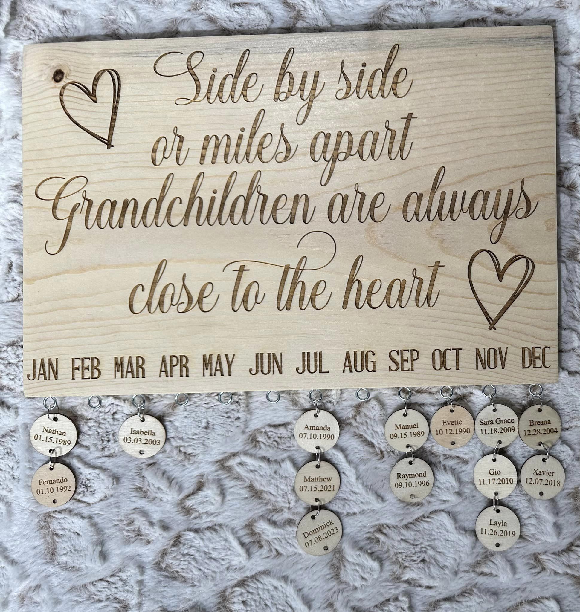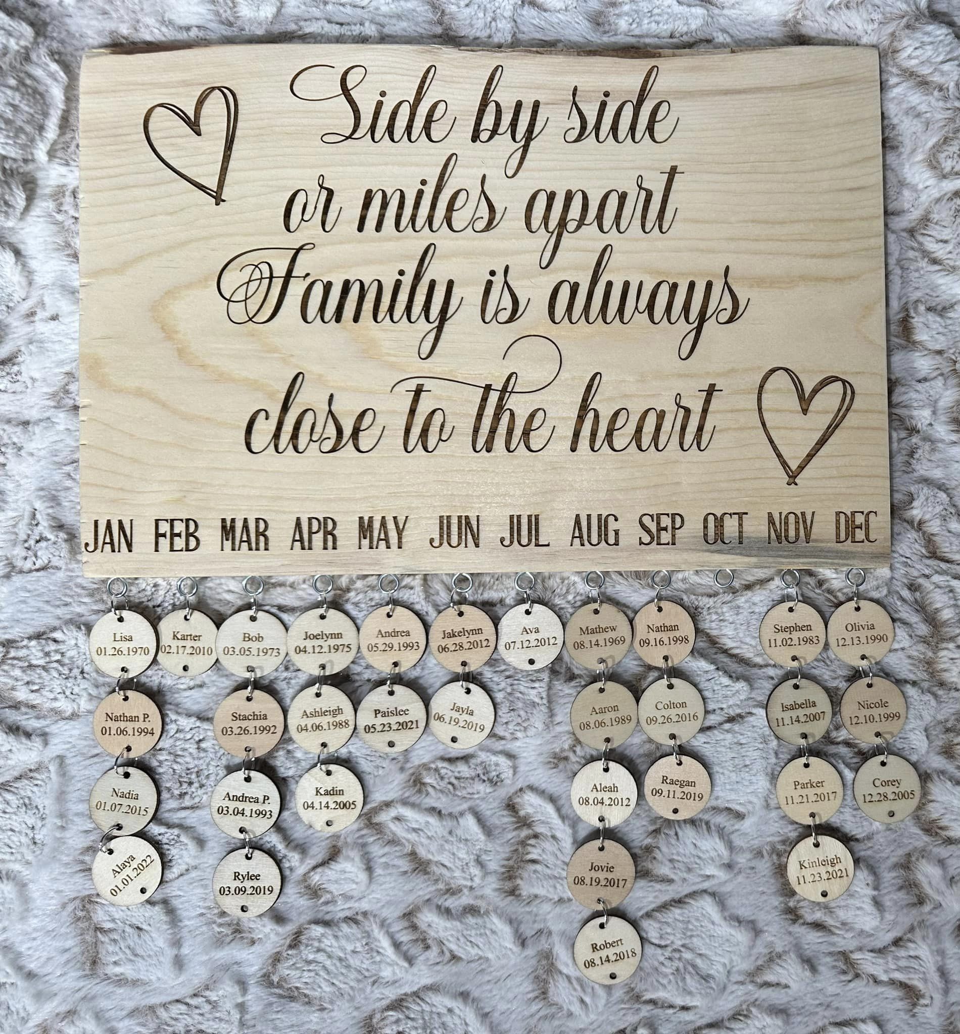 - Die Hauptplatte besteht aus Massivholz, naturbelassen und unbefleckt. Ungefähr 13,75 Zoll breit und 9,25 Zoll hoch. An der Unterseite hängen 1-Zoll-Kreise, auf denen die Geburtstage Ihrer Familie stehen. Ich werde die Namen und Geburtstage in die Kreise eingravieren und sie zusammengebaut verschicken. Ich werde auch ein paar zusätzliche leere Kreise beilegen, damit Sie alle neuen Geburtstage hinzufügen können, die hinzugefügt werden müssen.