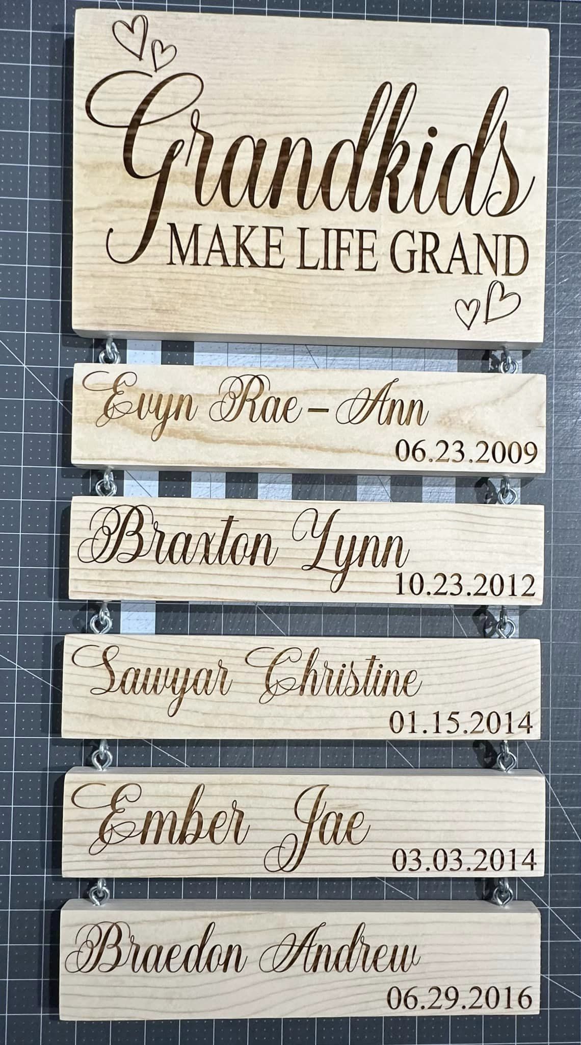 - Jedes Brett ist aus Massivholz, naturbelassen und unbefleckt. Das obere Brett ist etwa 35 cm breit und 23 cm hoch. Jedes darunter hängende Brett ist etwa 35 cm breit und 7,6 cm hoch. Da jedes Brett massiv und etwa 2,5 cm dick ist, ist dieses Schild sehr strapazierfähig. Ich empfehle nicht, mehr als 5-6 Namen darauf zu platzieren.