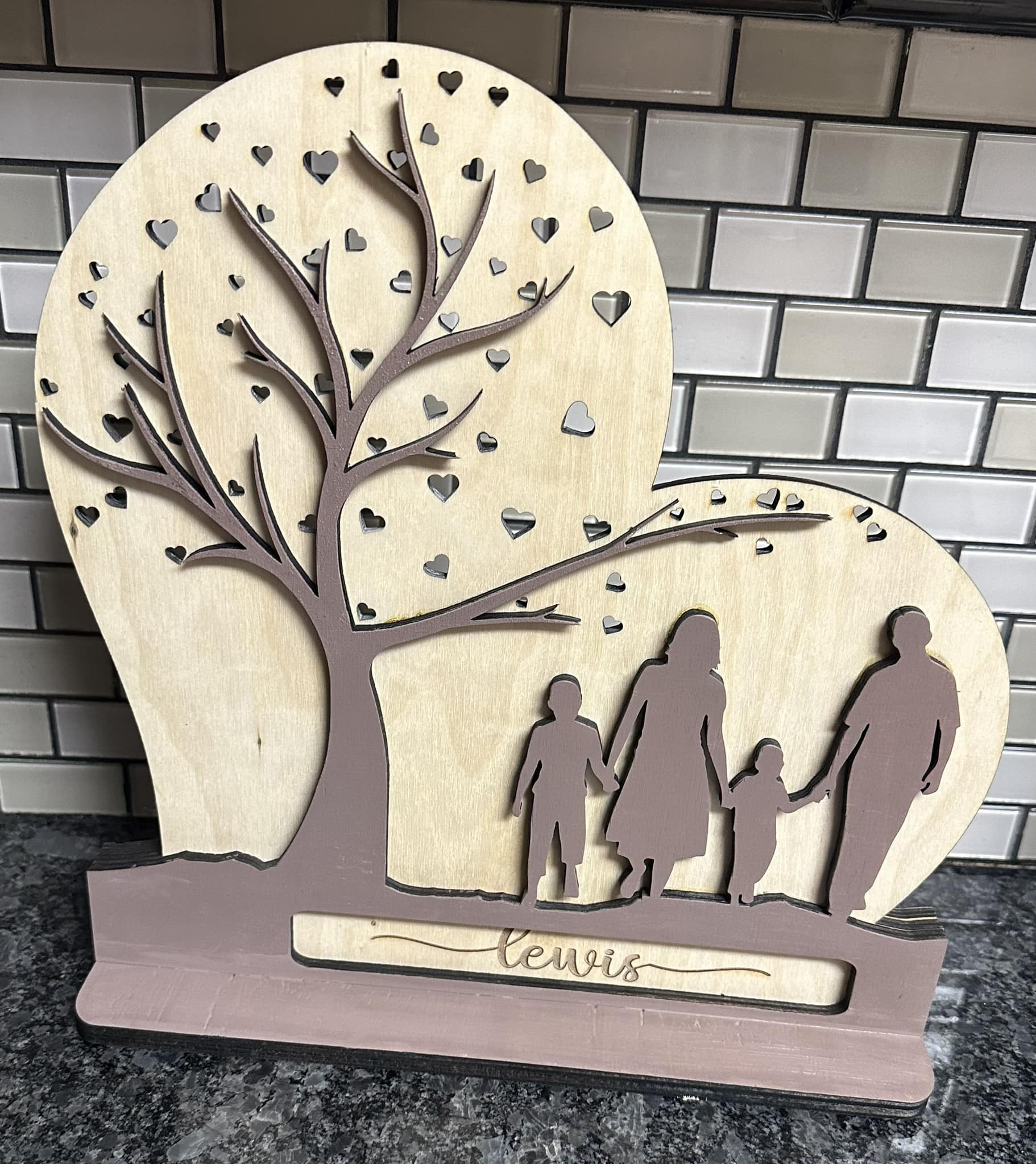 - Mit dem Laser aus 1/4-Zoll-Birkenholz geschnitten und graviert. Jede Schicht ist geschnitten, der Familienname ist eingraviert.