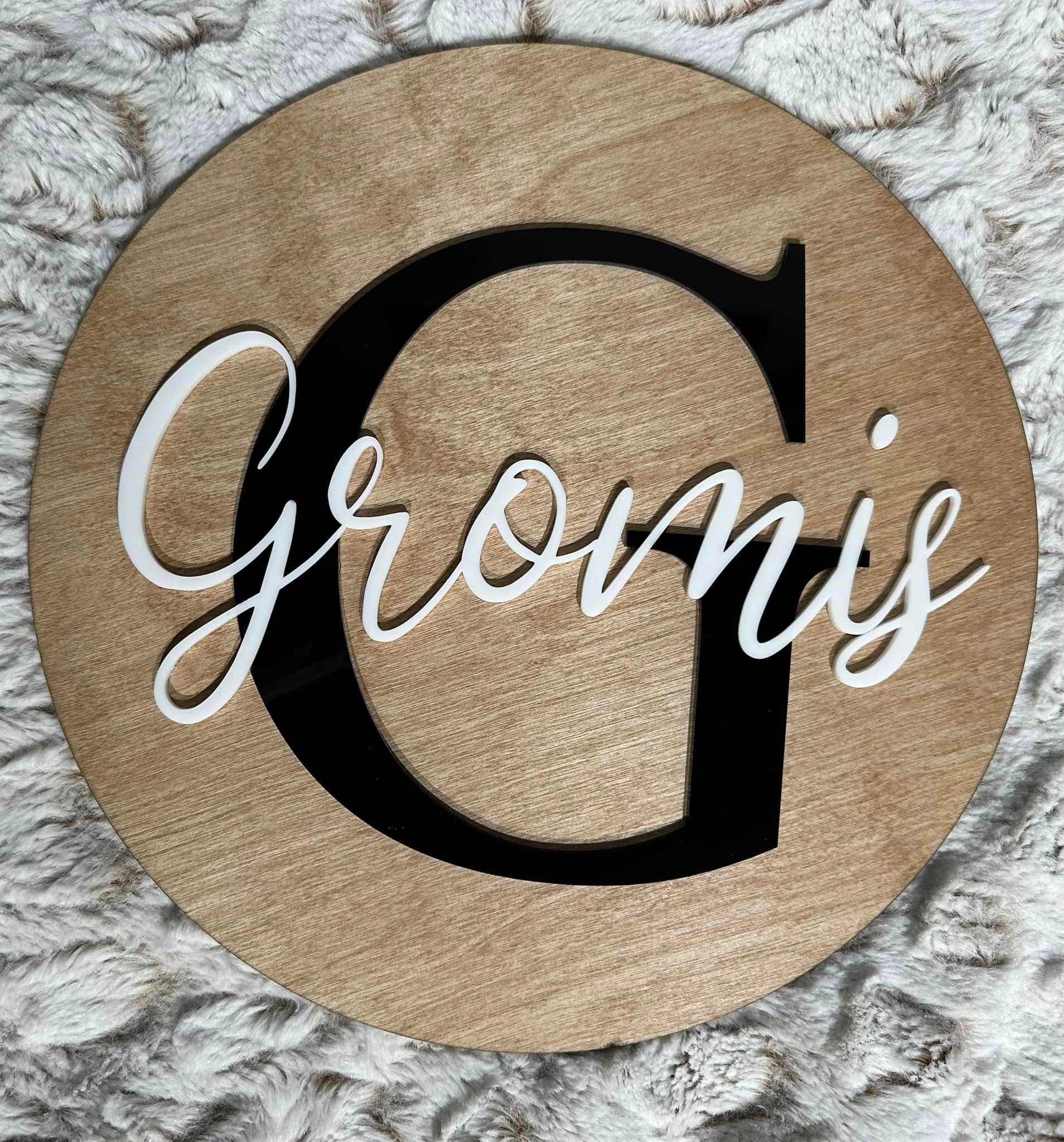 - Die runde Rückseite ist aus 1/4-Zoll-Birkenholz lasergeschnitten. Nachname und Buchstabe sind eine zweite Schicht, die ausgeschnitten und oben aufgeklebt ist! Der Buchstabe ist aus schwarz gefärbtem gegossenem Acryl geschnitten, während der Name aus weißem Acryl geschnitten ist.