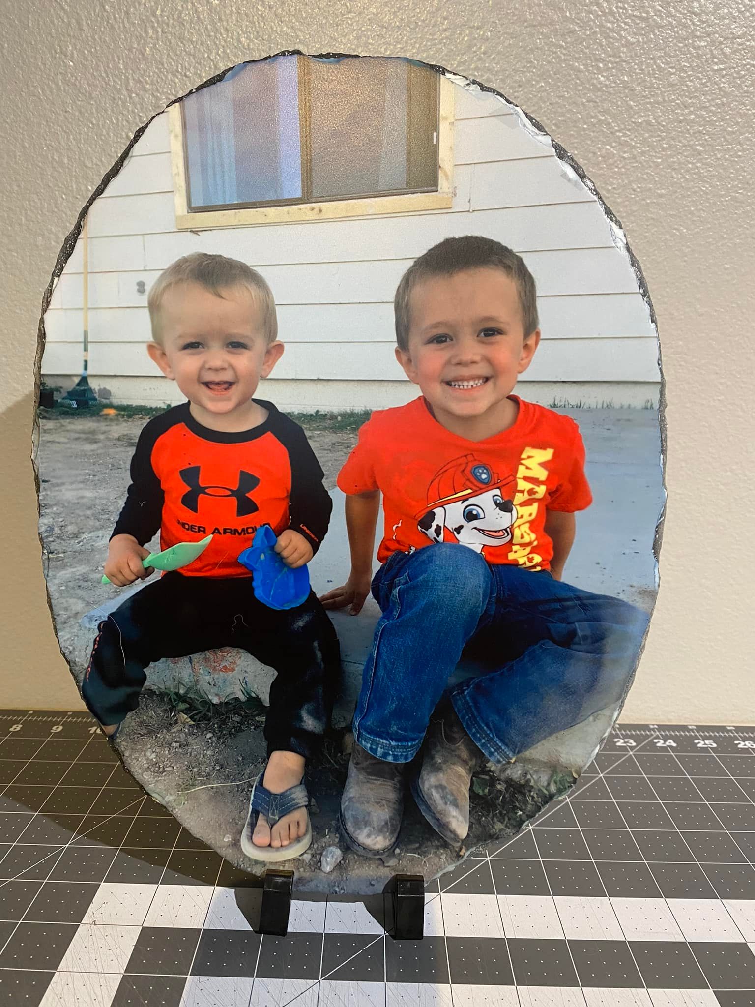- Ovale Fotoplakette in Sonderanfertigung, ca. 10,5 Zoll breit, 14 Zoll hoch und 3/8 Zoll dick.