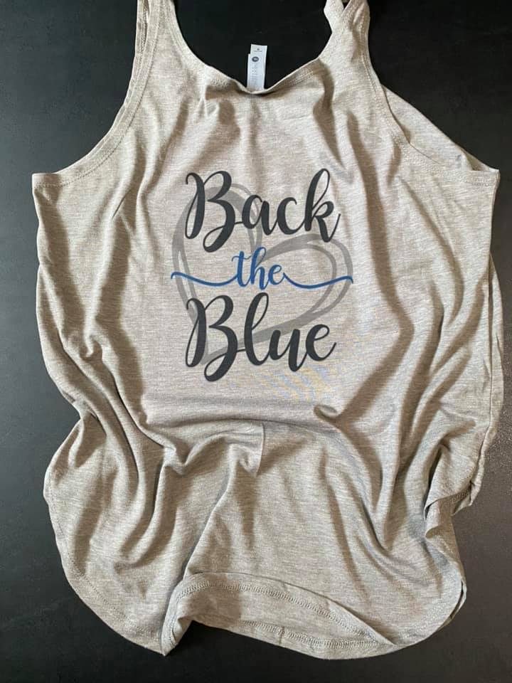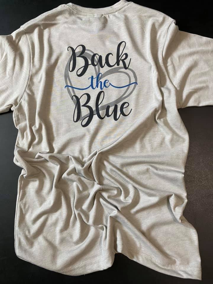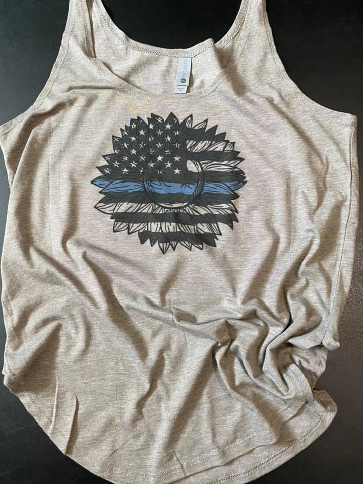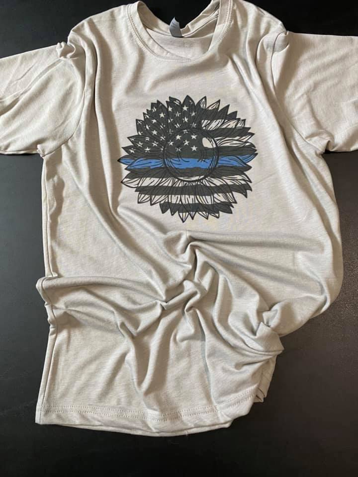 Dies ist ein Design für Vorder- und Rückseite. Auf der Vorderseite ist die Sonnenblume, auf der Rückseite „Back the Blue“. Wenn Sie das eine dem anderen vorziehen, anstatt beides, vermerken Sie es bitte im Anpassungsfeld, andernfalls erhalten Sie das hier gezeigte.