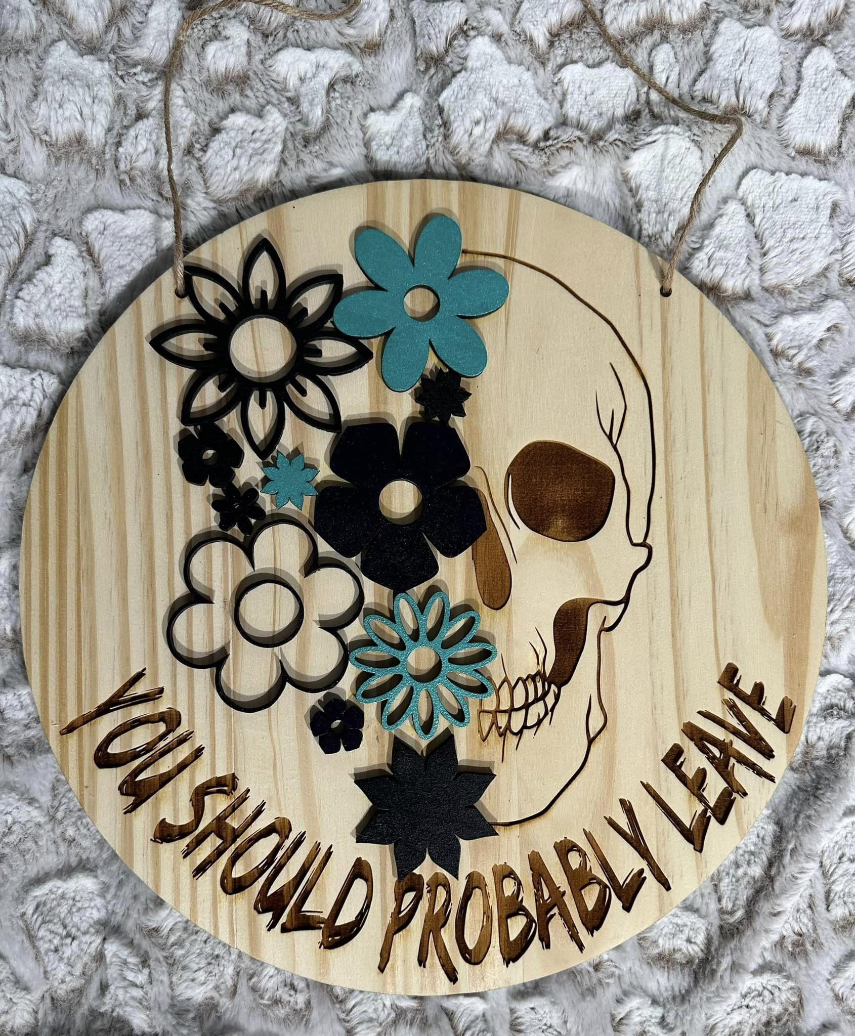 - Das Design wird auf einem 3/4 Zoll dicken Fichten-/Kiefern-/Tannenbrett ausgeführt. Totenkopf und Worte sind in das Brett eingraviert, während die Blumen ein separater Ausschnitt sind, der oben aufgeklebt ist!
